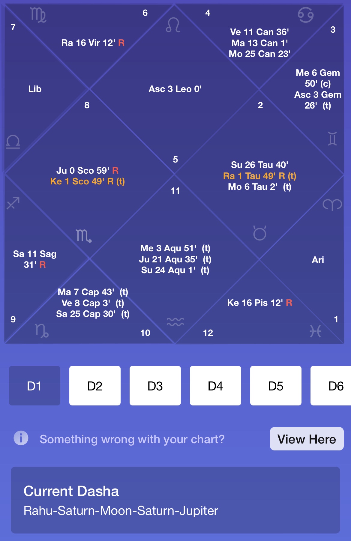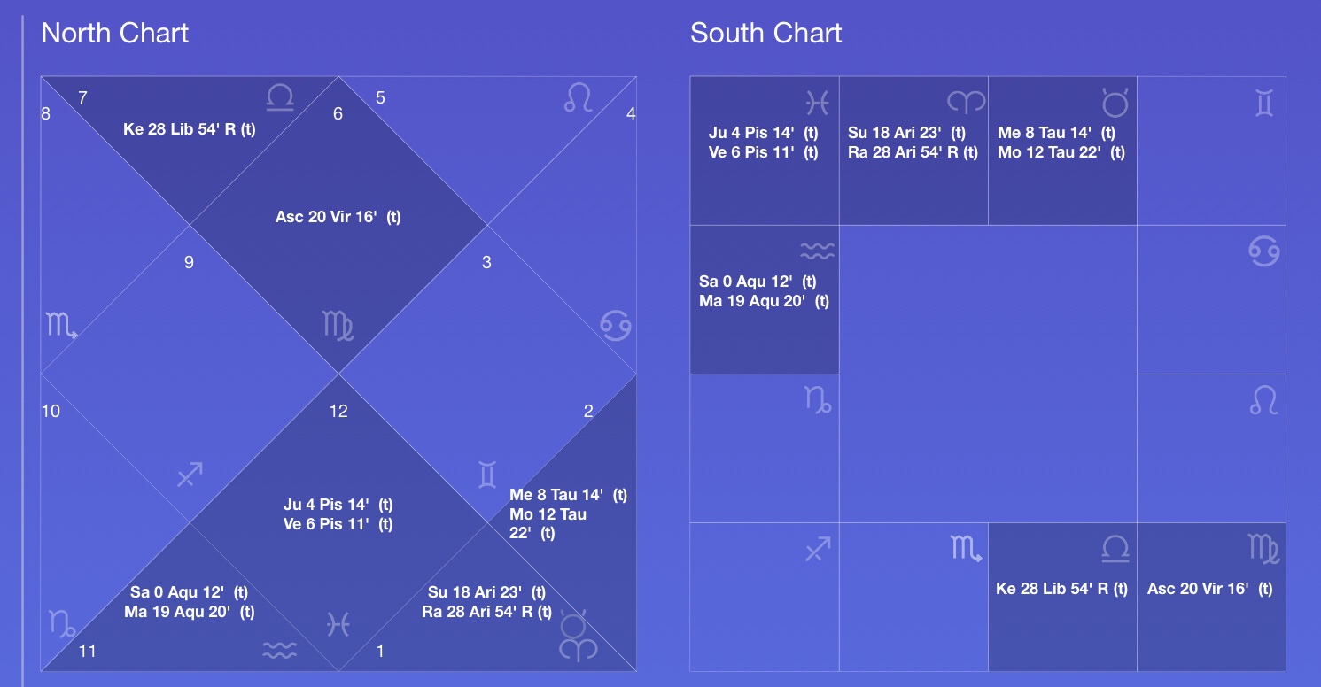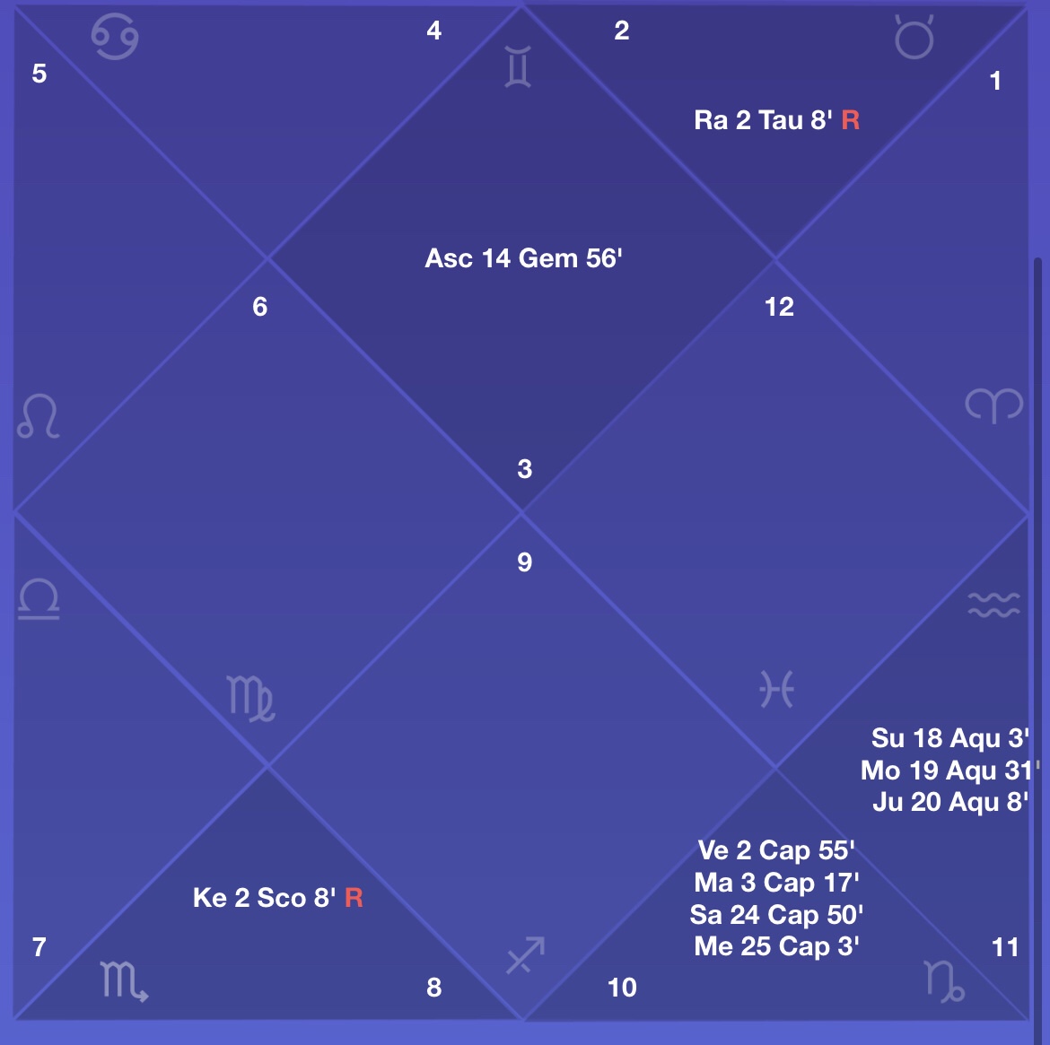 The ascendant ruler, Saturn, is in his 2nd house, in the fixed air sign of Aquarius. The karmic goal, to teach what has been learned to all sentient beings. The fixed sign under Saturn rule points to a process of slow but strong and steady growth through persistent work. The development of the mind and expression via language, curiosity, and difficulties are suggested.
